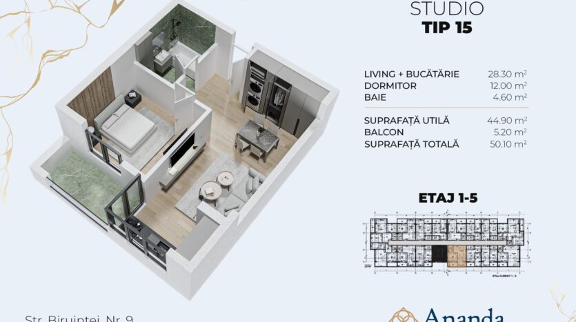 Apartamentul are o suprafata utila de 44.90 mp, la care se adauga un balcon de 5.20 mp, rezultand o suprafata totala de 50.10 mp.