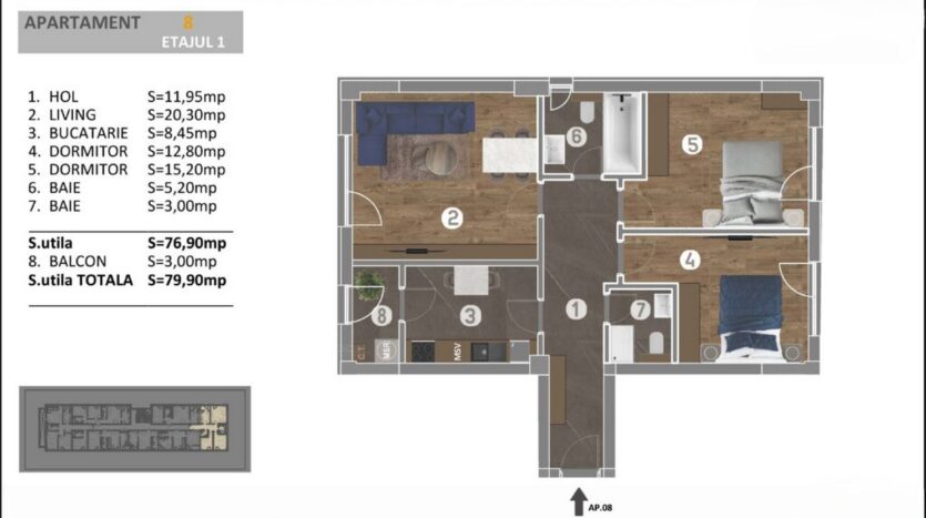 Hol: 11.95 mp, living: 20.30 mp, bucatarie: 8.45 mp, dormitor 1: 12.80 mp, dormitor 2: 15.20 mp, baie 1: 5.20 mp, baie 2: 3.00 mp, balcon: 3.00 mp