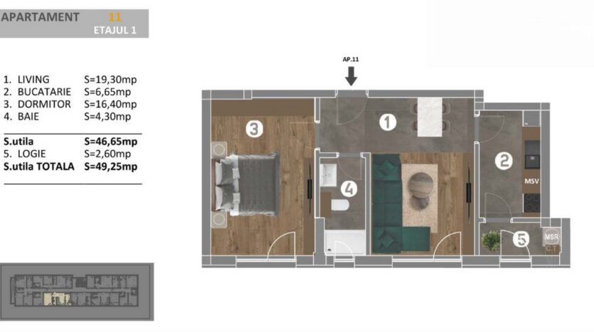 Cu o suprafata utila de 46.65 mp si o logie de 2.60 mp, apartamentul ajunge la o suprafata totala de 49.25 mp.